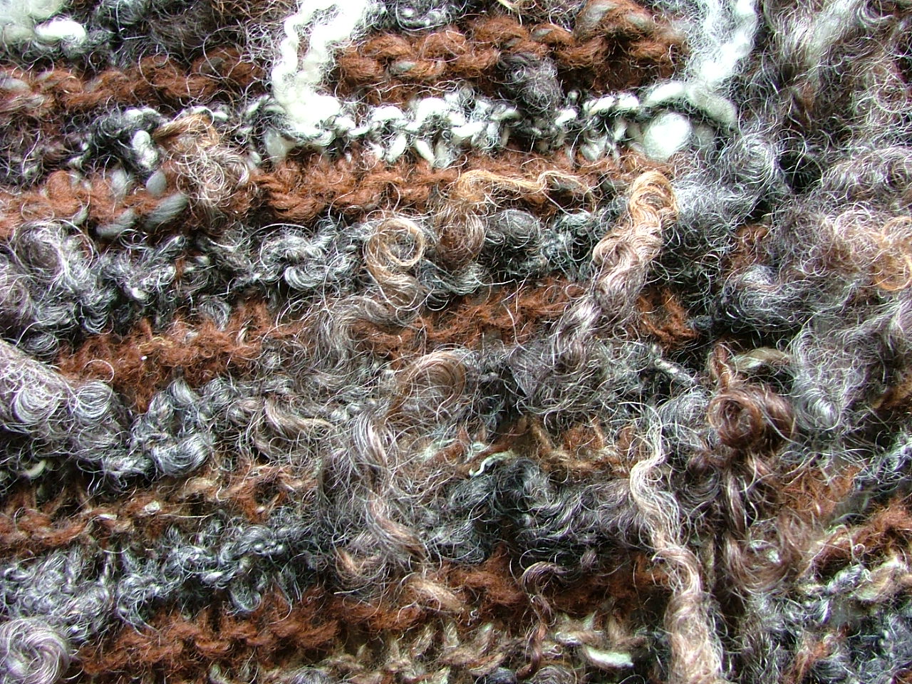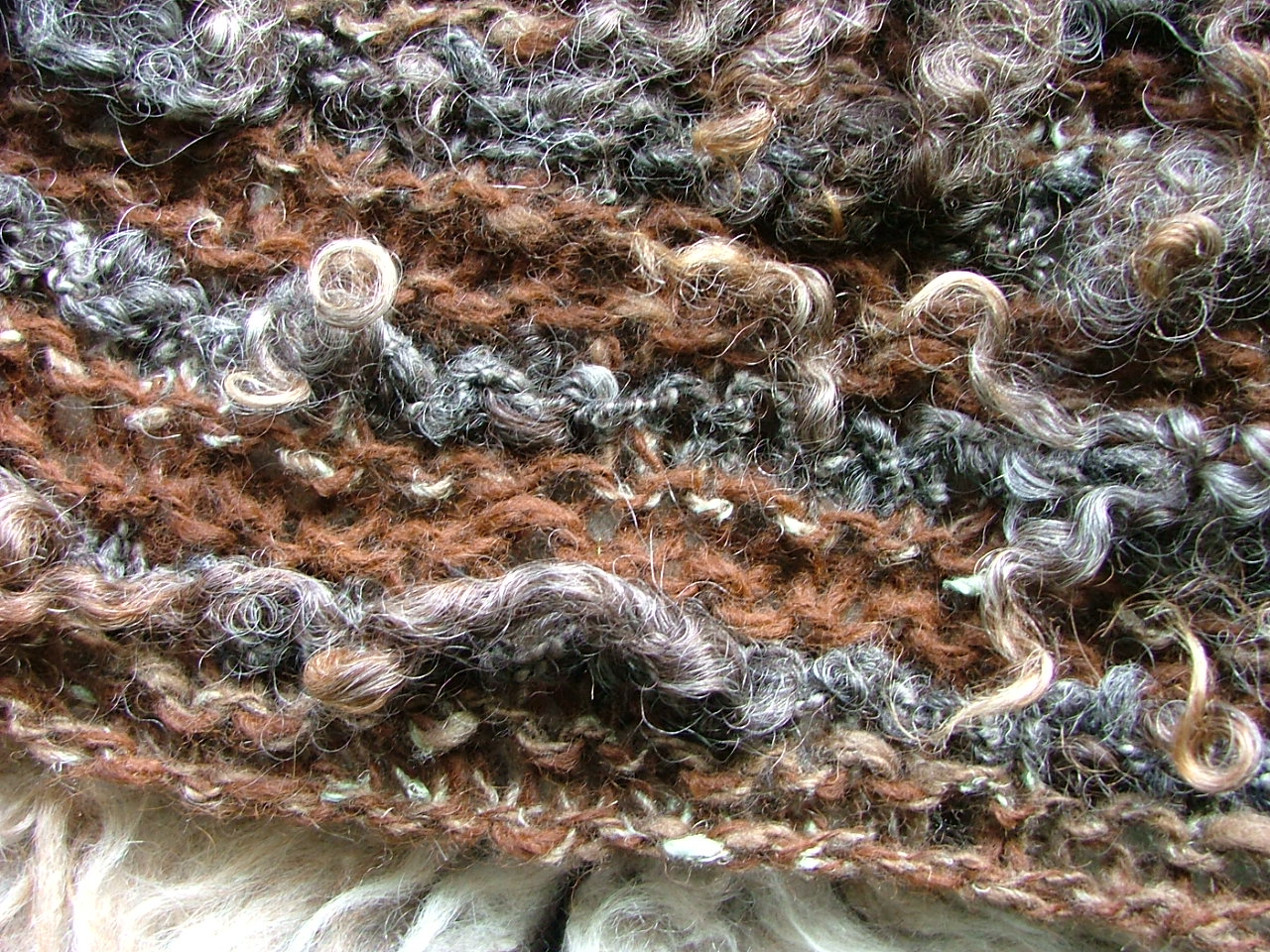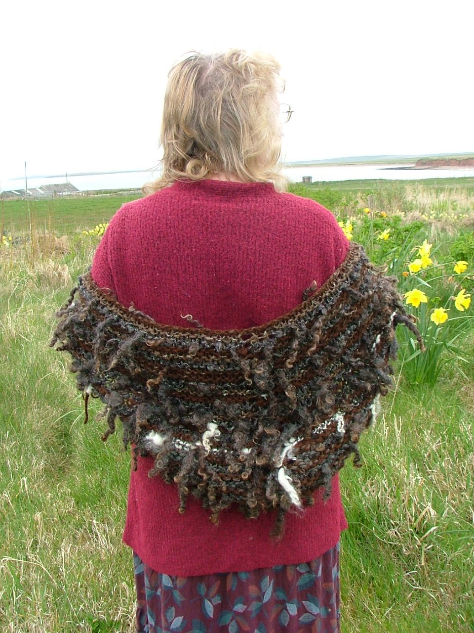 This shrug or hap – to use a Shetland term – is made from hand-spun yarns. These are Wensleydale locks from fleeces of sheep on the neighbouring island of Sanday, yarn spun from the Orkney seaweed-eating North Ronaldsay sheeps’ fleeces and Alpaca blended with black bamboo. Extra fine merino, cashmere, polyamide.