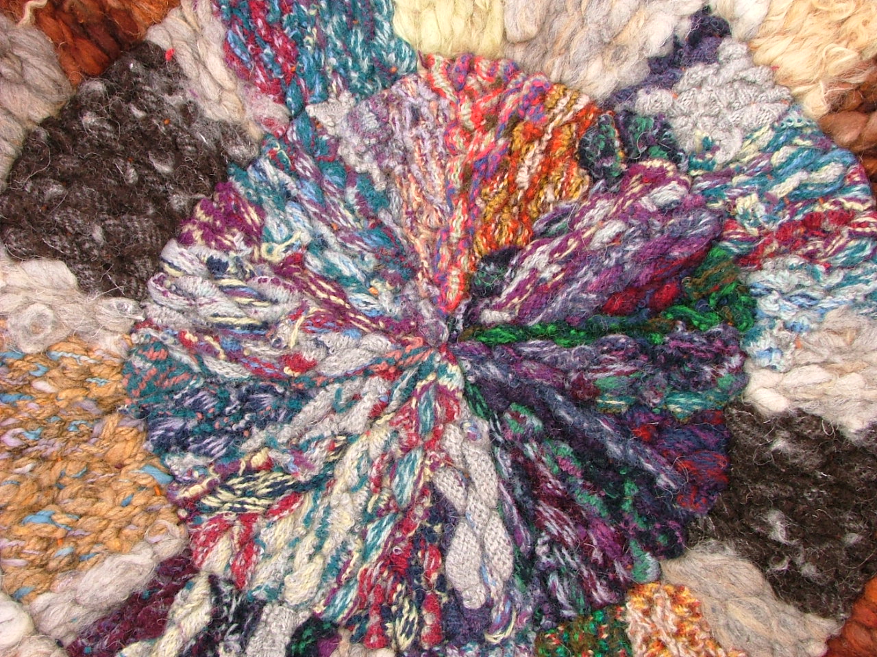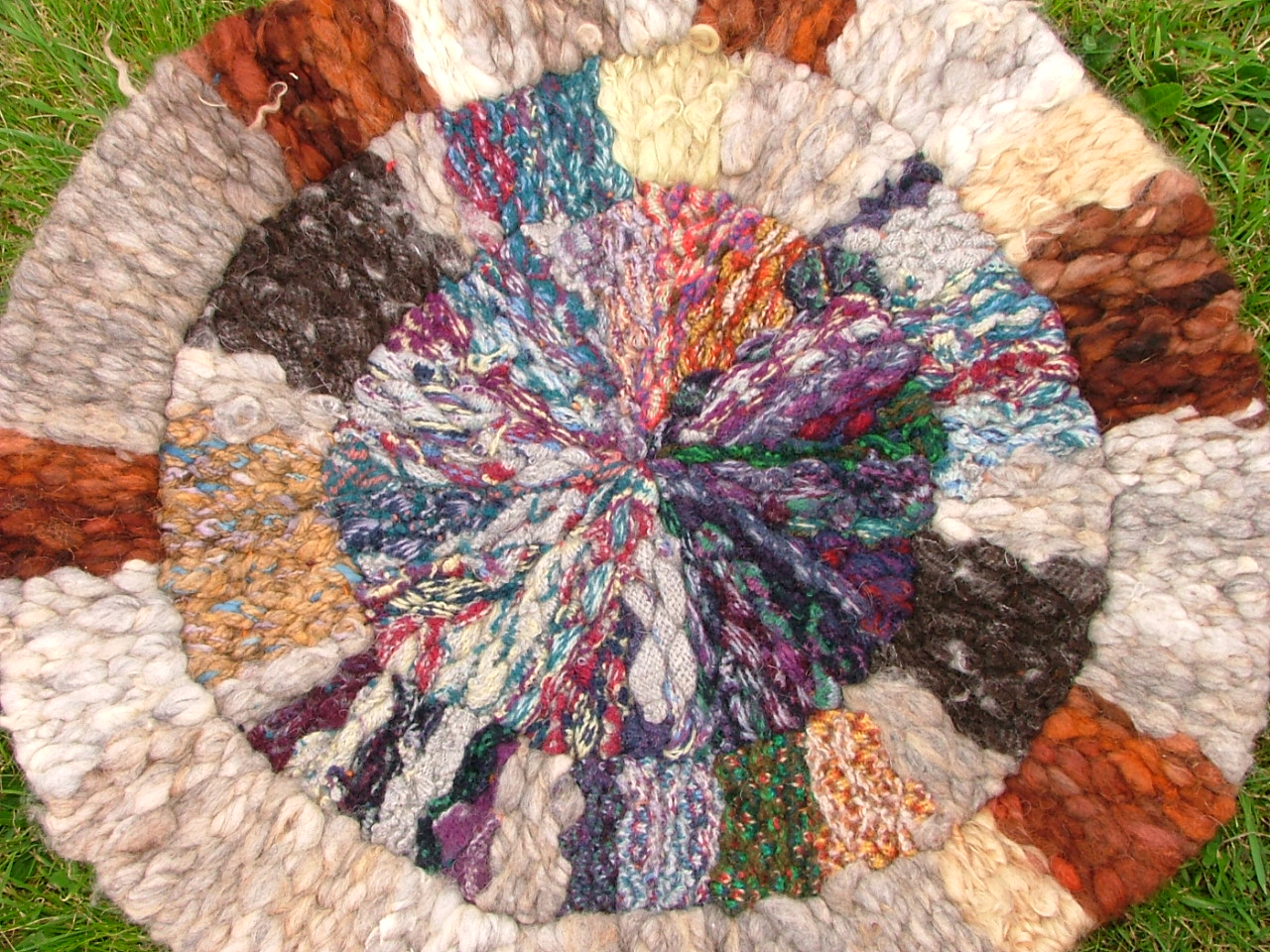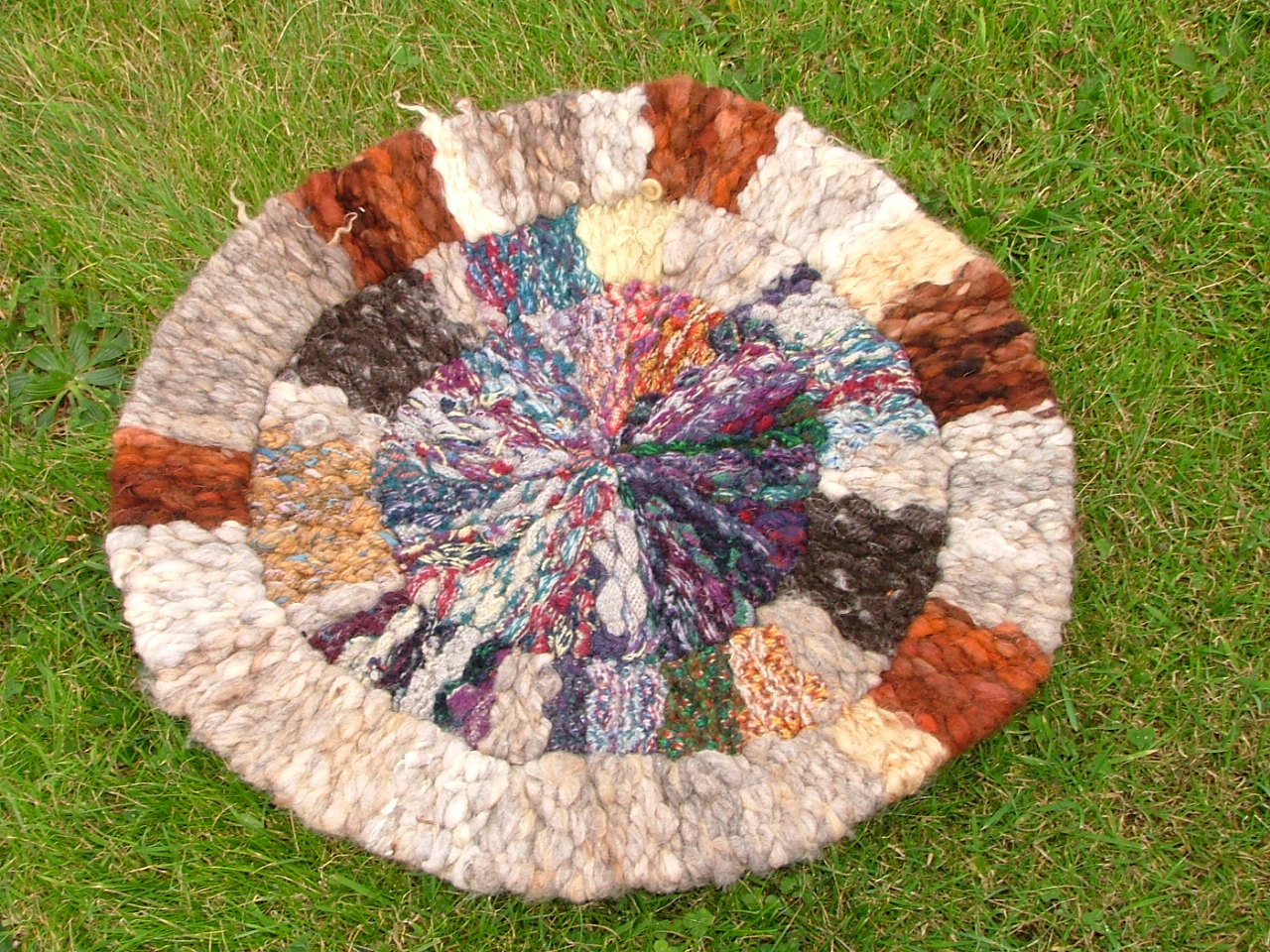 Woven on a peg loom this circular rug has been created using natural-coloured fleece from Orkney’s native rare breed seaweed-eating North Ronaldsay sheep, Angora goats’ fleece from the neighbouring island of Sanday along with knitted Shetland wool patterened strips and woven strips of Zwartble sheeps’ wool from Orkney.