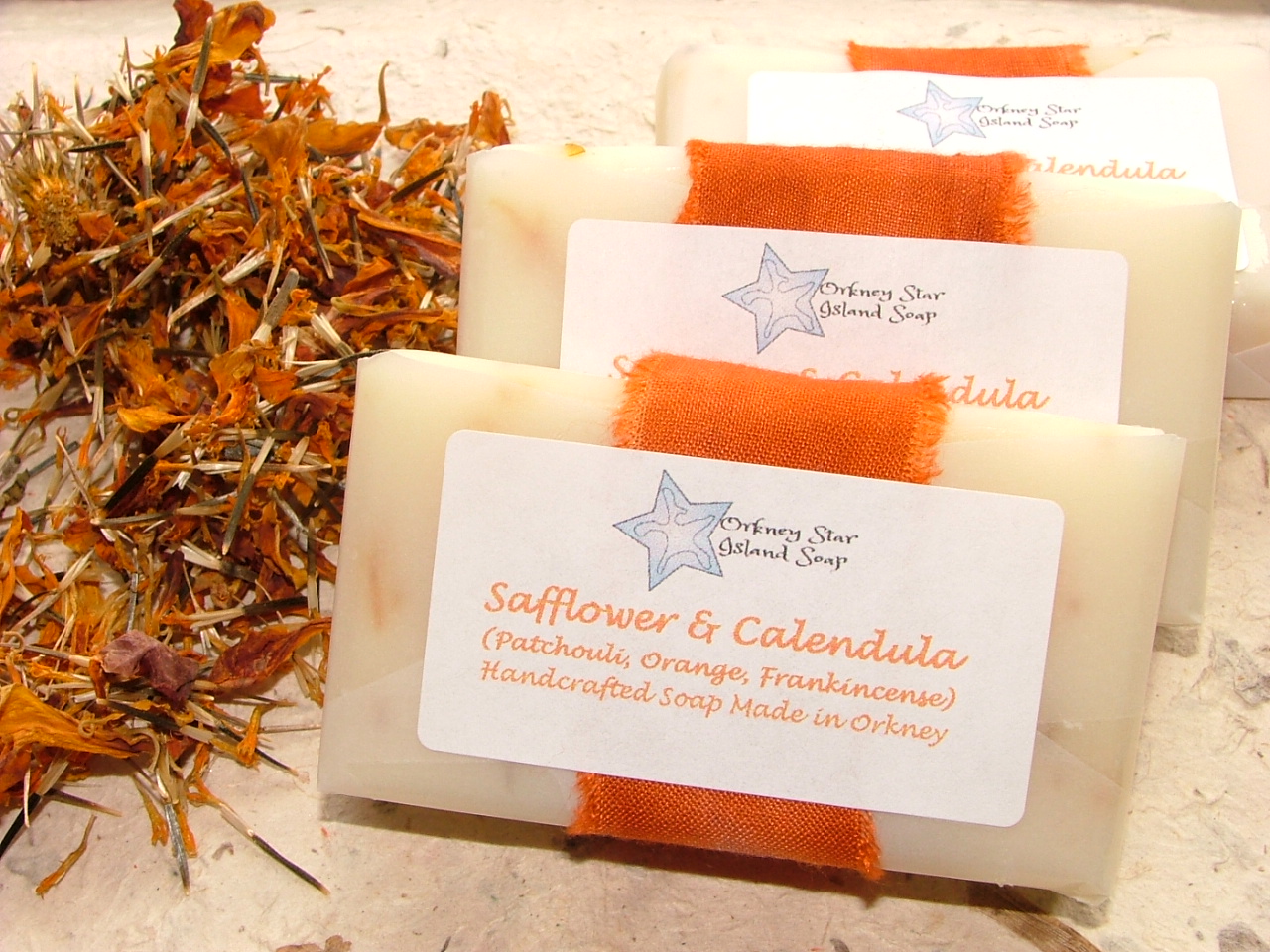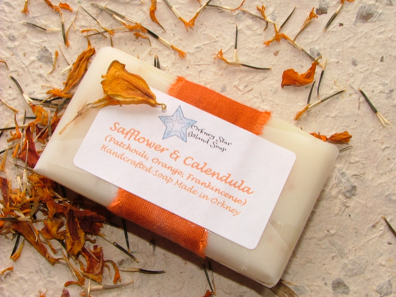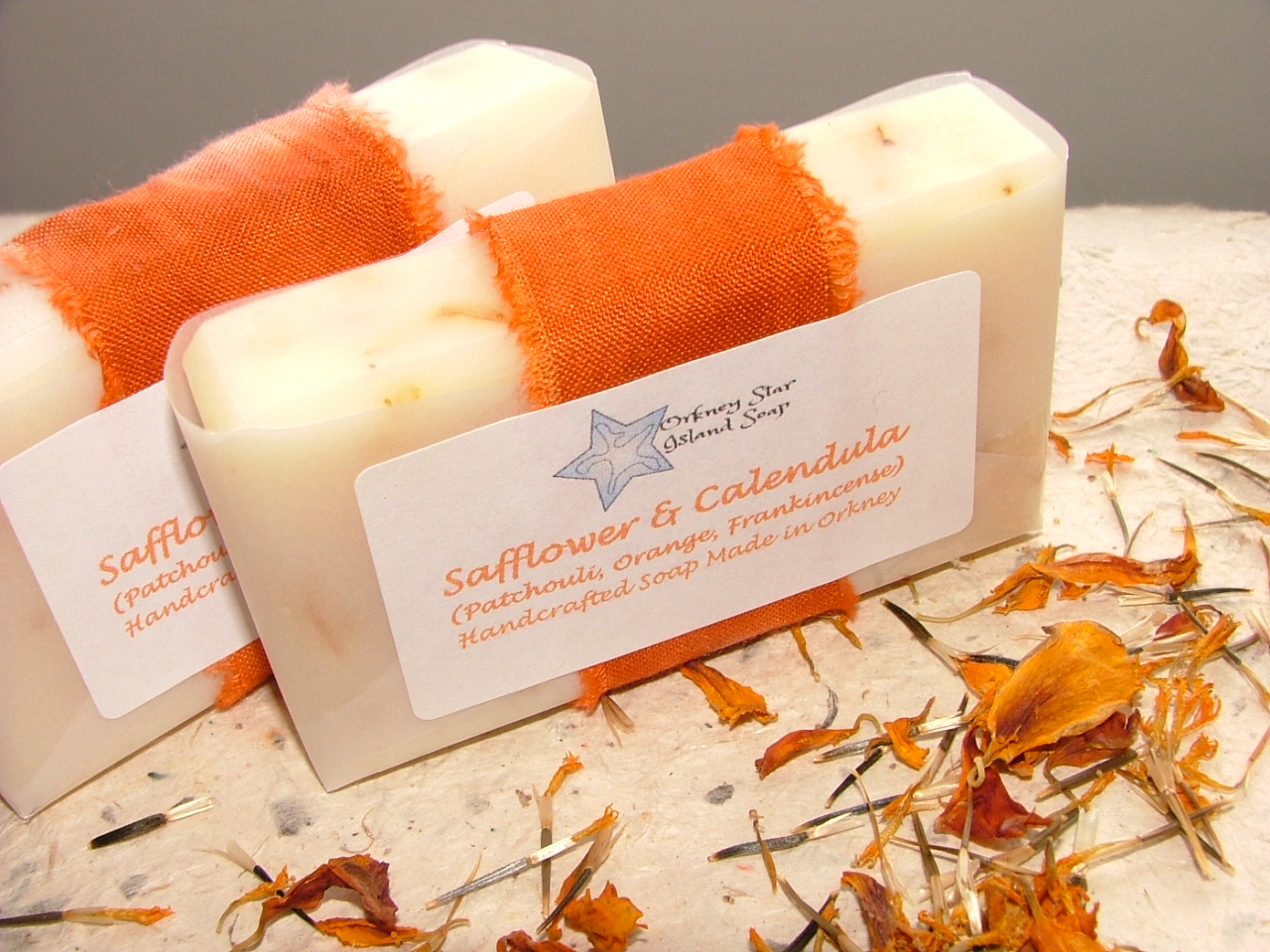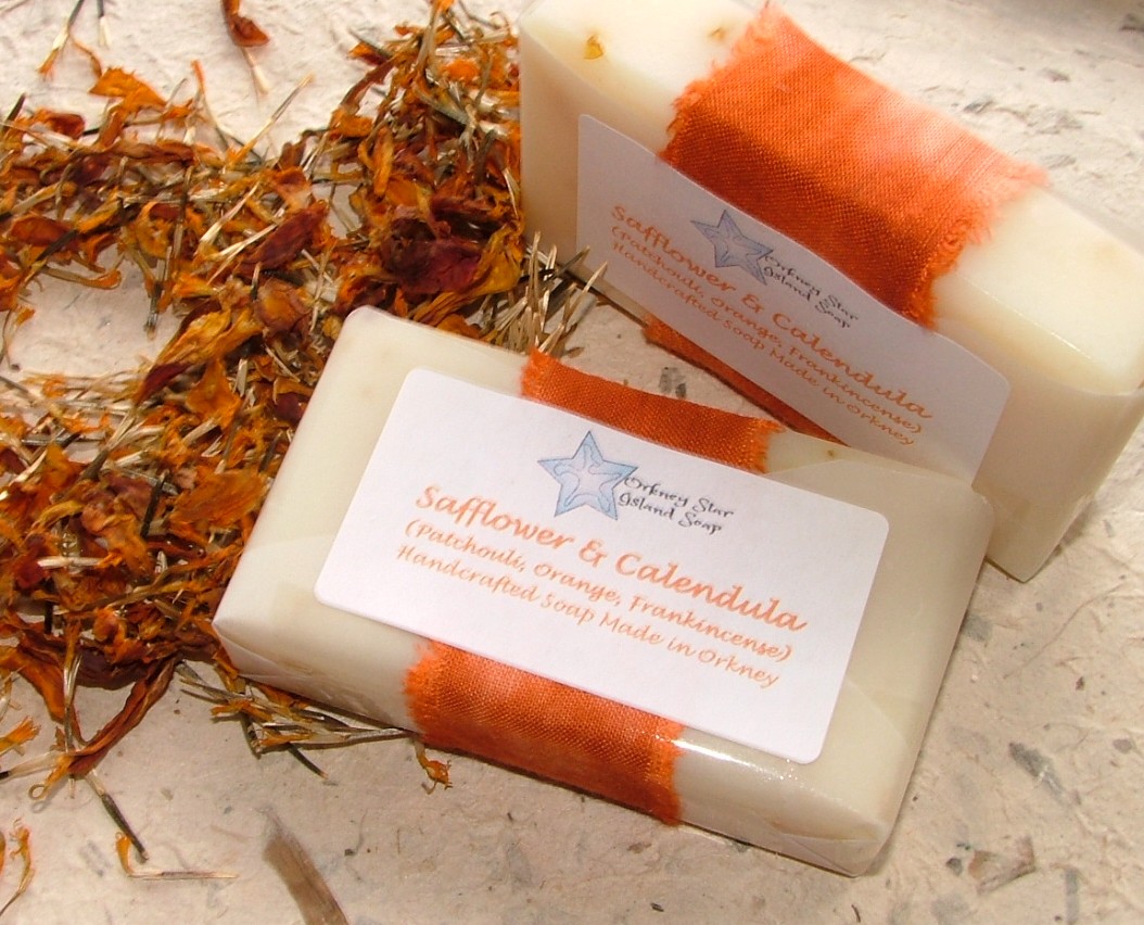 Safflower and Calendula soap has a refreshingly honest scent produced by my blend of Patchouli and Sweet Orange essential oils with a dash of Frankincense.  INGREDIENTS: Coconut Oil (Sodium Cocoate), Safflower Oil (Sodium Safflowerate), Palm Oil – responsibly sourced (Sodium Palmate), Aqua, Glycerin, Patchouli (Pogostemon Patchouli), Sweet Orange (Citrus Auriantium Dulcis) essential oils, Parfum, Linalool, Citronellol, Calendula Flowers.