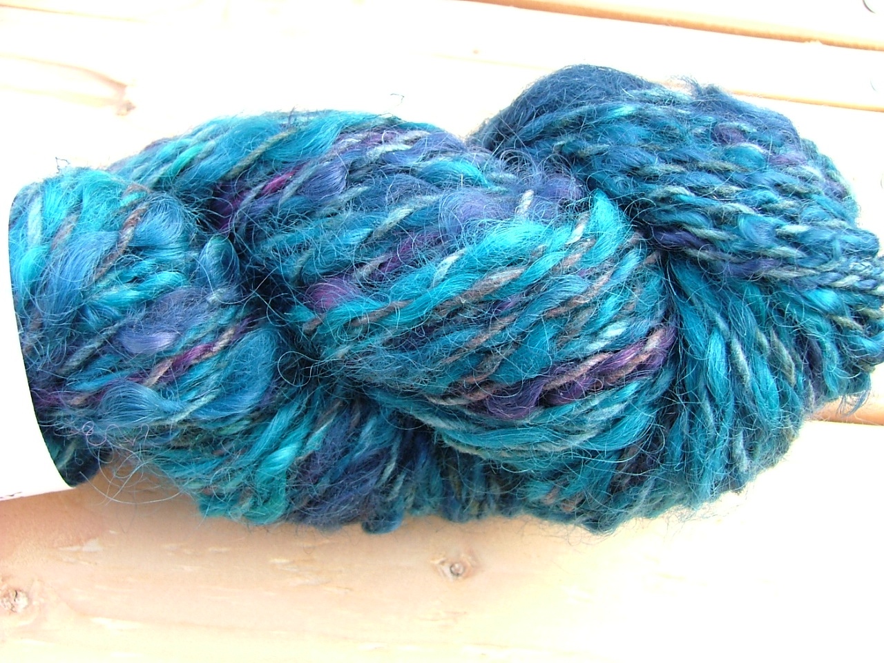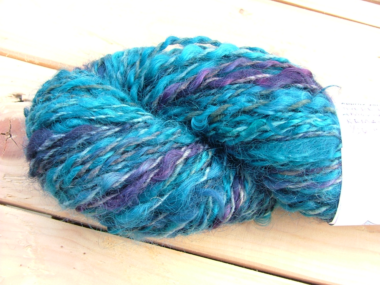Wool from long-stapled Masham sheep grown in Yorkshire by a friend of a friend. My friend brings fleeces to Stronsay for me to spin. Plied with a cotton, nylon and silk blend.
