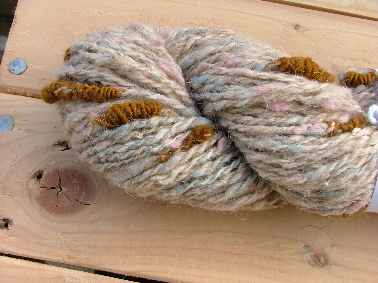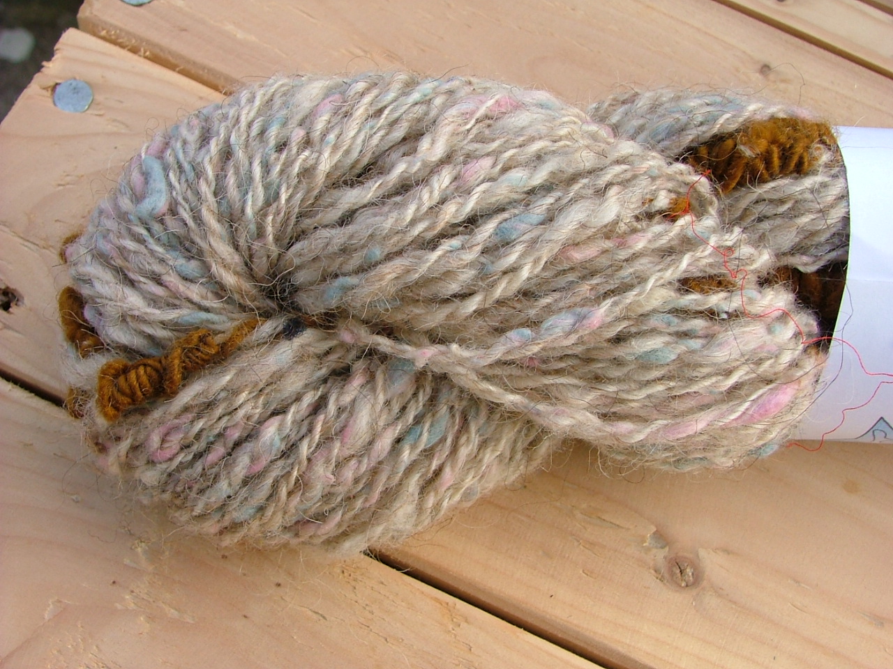 North Ronaldsay wool from Orkney’s native seaweed-eating sheep blended with pale blue and pink cotton and brown merino wool stacks.