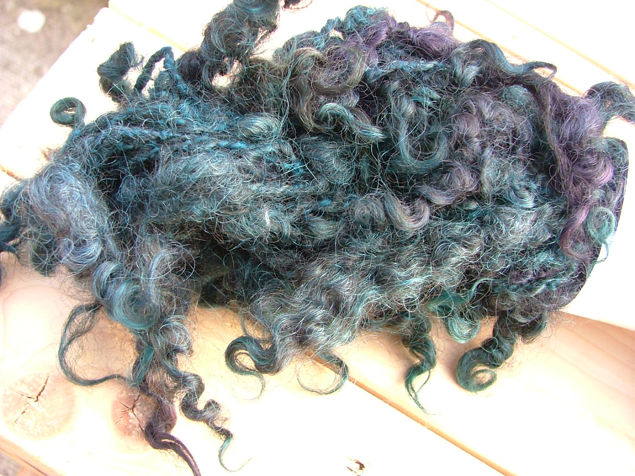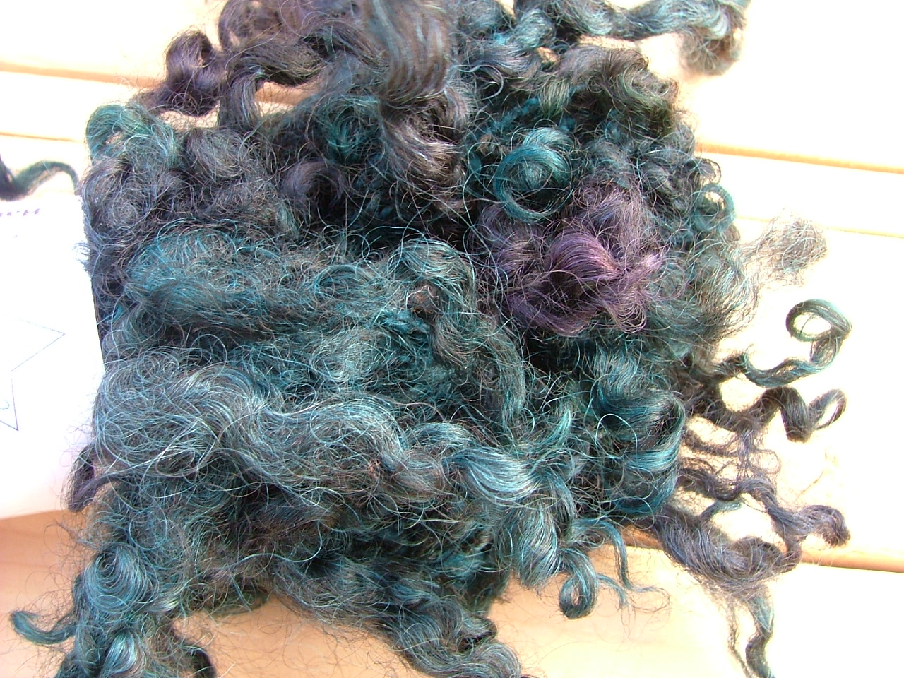 Curly Wensleydale locks from sheep grown in the neighbouring island of Sanday dyed to the deepest, darkest blue with merino, cashmere, polyamide.