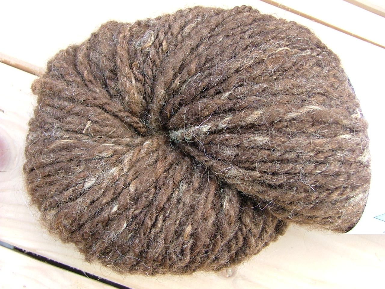 Medium brown – peat colour with flecks of lighter brown. 2-ply. Chunky. Soft.